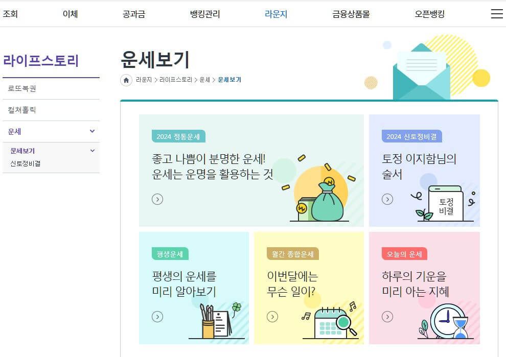 또 다른 은행권인 농협에서 운영 중인 운세 사이트 또한 인기가 많습니다. 2024년 신년운세, 토정비결이 업데이트되었으며, 오늘의 운세, 월간 운세 다양한 토정비결을 제공하고 있으니 관심 있으신 분들은 아래에서 확인하시길 바랍니다.