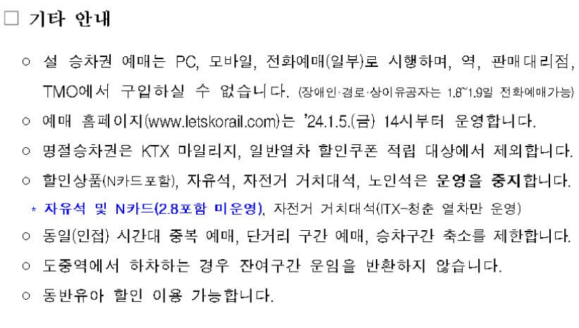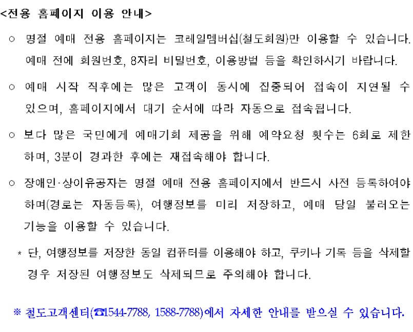 - 명절승차권은 KTX 마일리지, 일반열차 할인쿠폰 적립 대상에서 제외됩니다.