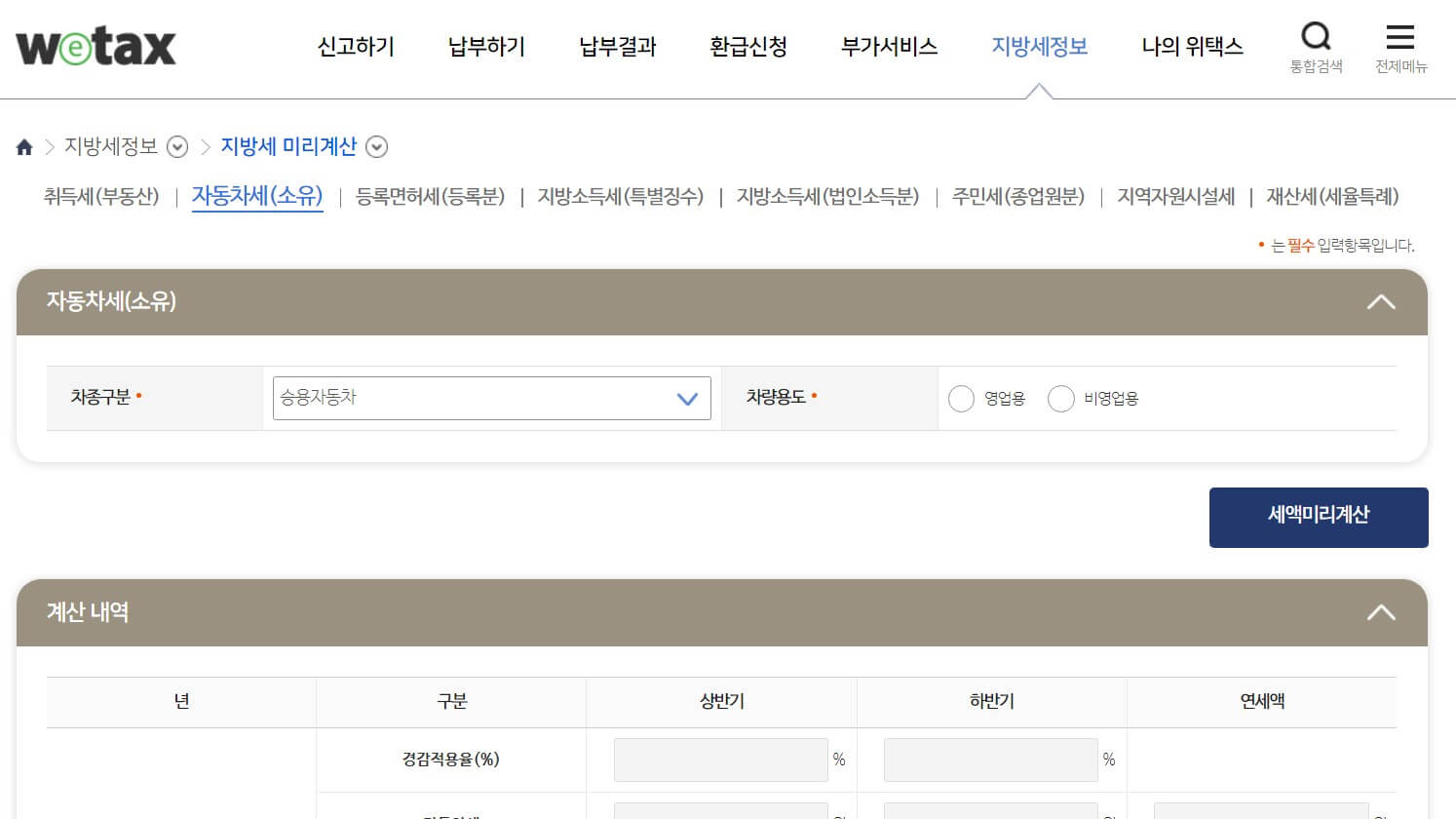 위택스 홈페이지 -> 지방세정보 -> 지방세 선산정 -> 자동차세