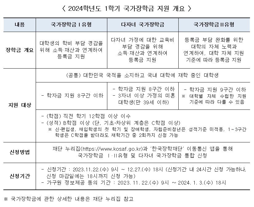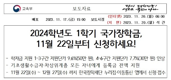 세수 부족으로 2024년도 대부분의 예산이 감액되는 와중에도 교육부의 예산안은 2023년 대비 1,213억 원이 증가한 4조 6,877억 원의 예산을 책정하였고 이 중에는 국장장학금 지원비 또한 포함되어 더욱 많은 학생들을 지원할 예정입니다. 또한 선착순이 아닌 지원항목에 해단되는 모든 사람에게 혜택을 주고 있으니 아래에서 알아보시고 지금 바로 신청하시길 바랍니다.