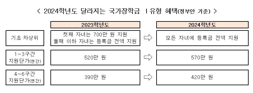 2024년 중위소득이 역대 최대 수준으로 인상되었기 때문에 그에 따른 소득분위 지원구간도 인상이 되어 더 많은 학생들이 국가장학금의 지원을 받게 되었습니다.
