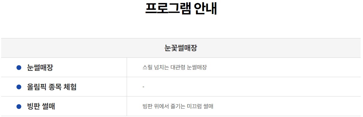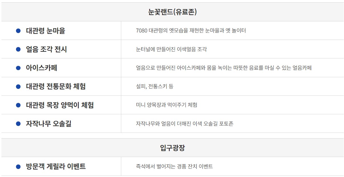 먼저, 눈과 얼음 위에서 즐기는 눈 & 빙판 썰매장이 있으며, 두 번째로 눈꽃 랜드를 표현한 마을에서 각종 사진을 찍으면서 터널을 지나고 얼음 카페 체험을 할 수 있는 프로그램이 있습니다.