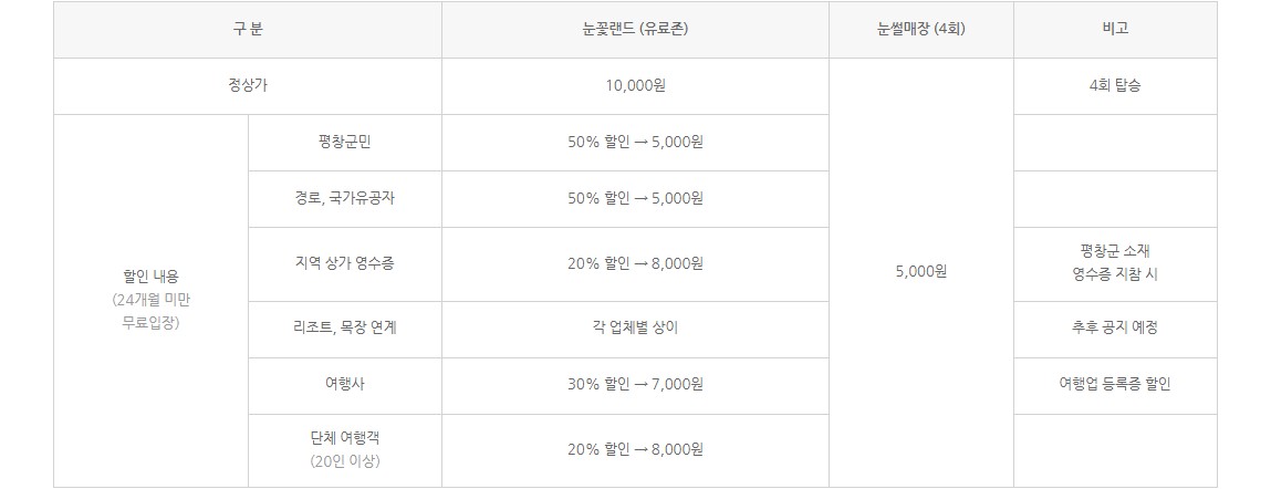 이용가격 : 눈꽃랜드 (유료존) 10,000원 눈꽃썰매장 5,000원 (4회권)