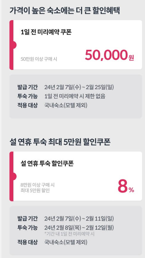 야놀자만의 다양한 혜택의 쿠폰도 지급하고 있습니다. 50만 원 이상 구매 시 5만원할인 쿠폰, 설 연휴 투숙 8만 원 이상 구매 시 최대 5만 원 할인이 되는 8% 쿠폰, 고속버스 최대 3천 원 할인받을 수 있는 10% 쿠폰, 그 외에도 서울-경기-인천에서 사용할 수 있는 쿠폰, 1차 페스타 종료기간 25일 이후에도 사용할 수 있는 쿠폰등을 지급하니 여행을 계획 중이신 분들은 꼭 지급받아 이익보시길 바랍니다.