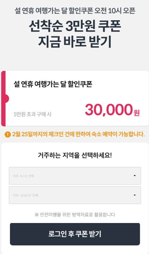 2월 7일부터 25일까지 9만 장의 3만 원 숙박쿠폰을 3개의 참여사 야놀자, 여기 어때, G마켓에서 오전 10시 매일 선착순으로 나눠주고 있습니다. 정부에서 주는 3만원 혜택에 더하여 각 여행사마다 할인 + 카카오페이등 결제사에서도 참여하여 3만 원 쿠폰을 받고도 10% 할인을 받으실 수 있으니, 몰라서 손해 보지 마시고 아래에서 확인하시고 꼭 혜택누리시길 바랍니다.