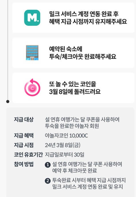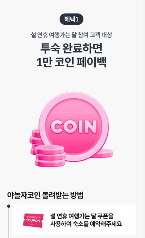 설 연휴 여행 가는 달 참여 고객 대상으로 투숙 완료하면 3월 8일 야놀자 1만 코인을 페이백 하는 행사도 진행하고 있습니다. 코인을 받으시는 날로부터 30일까지 사용하실 수 있으니 잊지 말고 사용하세요.