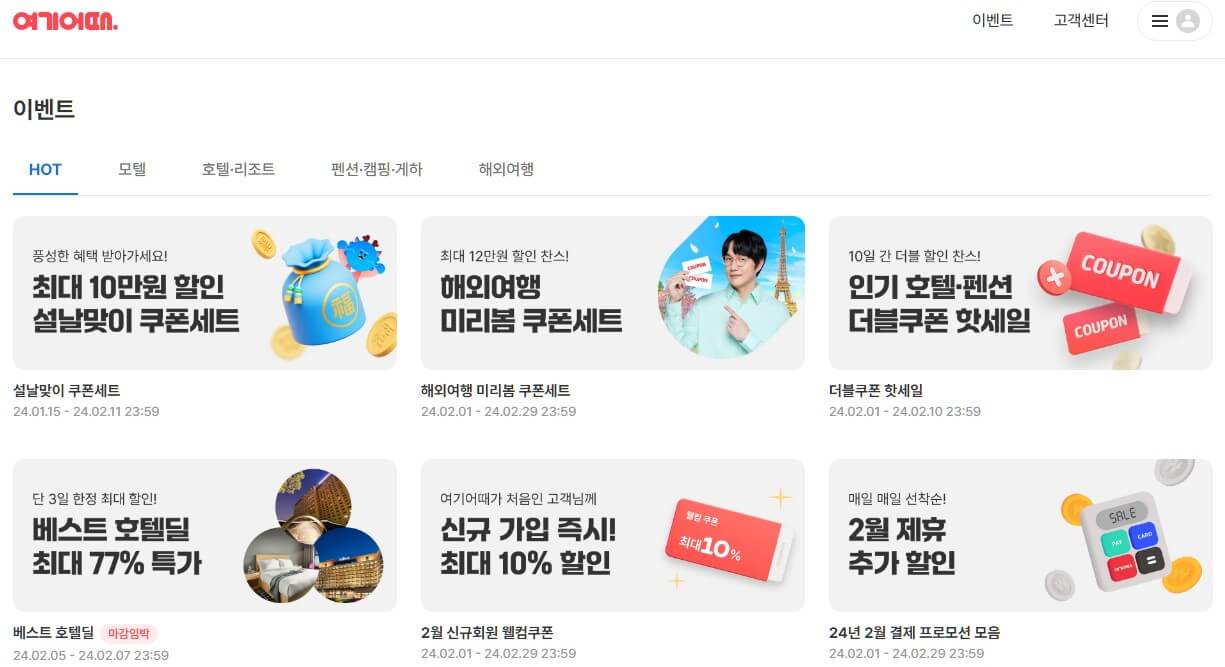 여기 어때에서도 2월 명절을 맞아 다양한 행사를 진행하고 있습니다. 다만 현재 이벤트 관련 공지가 올라오지 않아 확인 즉시 업데이트 하도록 하겠습니다.