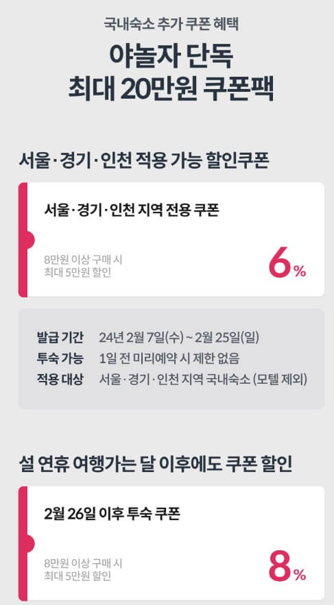 야놀자에서는 3만 원 쿠폰 지급 이외에 참여고객 혜택으로 야놀자 1만 코인 페이백, 고속버스 할인쿠폰, 서울-경기-인천 투숙객들을 위해 전용쿠폰 발급, 2월 26일 1차 행사 종료 이후에도 사용할 수 있는 쿠폰등 다양한 혜택을 드리고 있으니 자세한 내용은 아래에서 확인하시길 바랍니다.