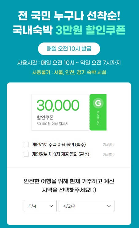 2월 7일부터 25일까지 9만 장의 3만 원 숙박쿠폰을 3개의 참여사 야놀자, 여기 어때, G마켓에서 오전 10시 매일 선착순으로 나눠주고 있습니다. 정부에서 주는 3만원 혜택에 더하여 각 여행사마다 할인 + 카카오페이등 결제사에서도 참여하여 3만 원 쿠폰을 받고도 10% 할인을 받으실 수 있으니, 몰라서 손해 보지 마시고 아래에서 확인하시고 꼭 혜택누리시길 바랍니다.