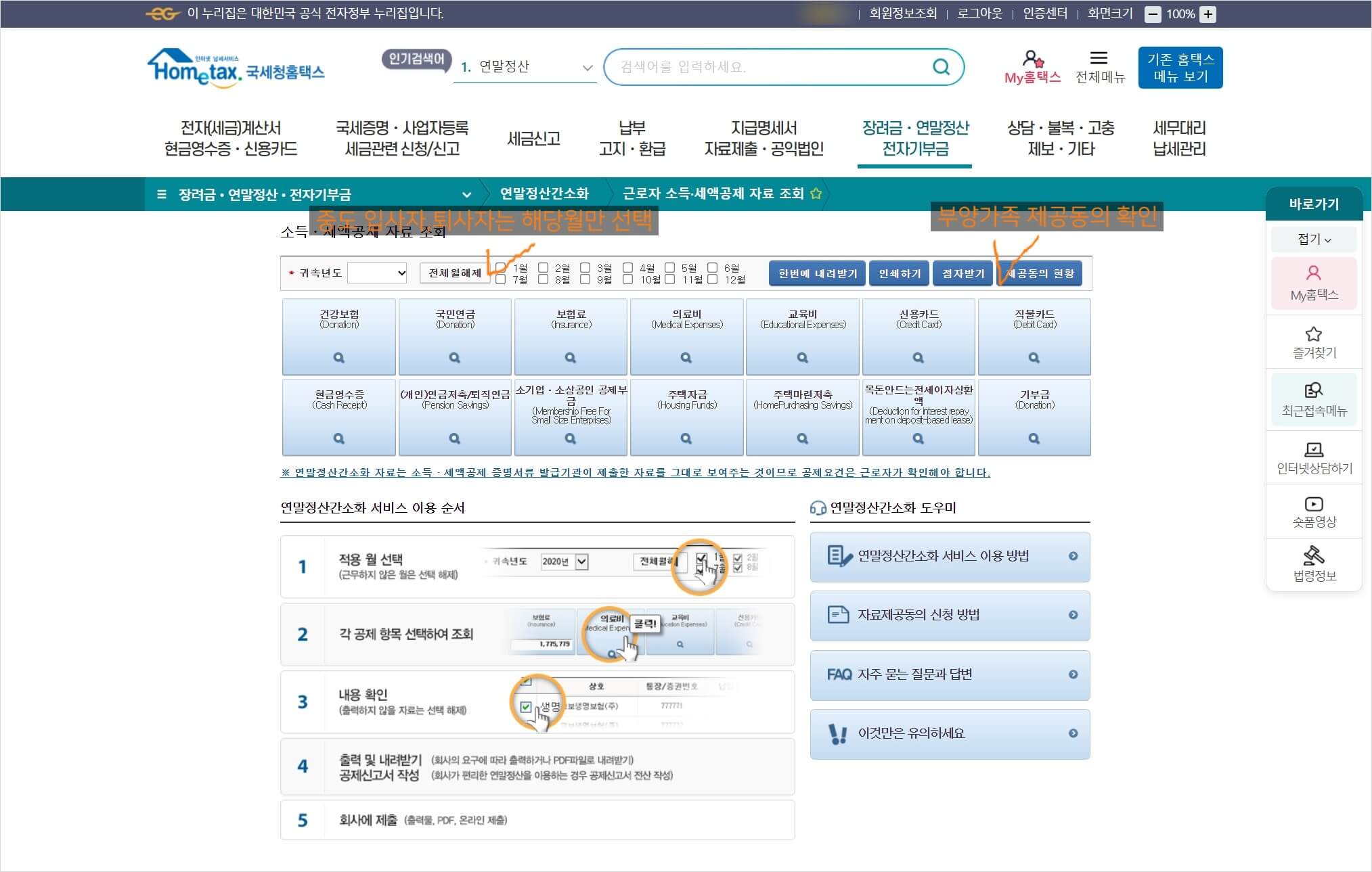 국세청의 홈페이지 홈택스에 본인인증하여, 자료제공 및 부양가족 동의를 하시면, 등록된 사람의 신용카드 사용내역, 보험료, 의료비 납입내역을 각 회사에서 국세청으로 제출합니다. 이는 연말정산 간소화 서비스에 접속하시면 등록된 내역을 확인하실 수 있으며, 2024년 1월 14일까지 회사에서 일괄제공 서비스를 등록하고 근로자가 19일까지 제공 동의해 주면 20일부터 회사에서 연말정산 작업을 하게 됩니다.