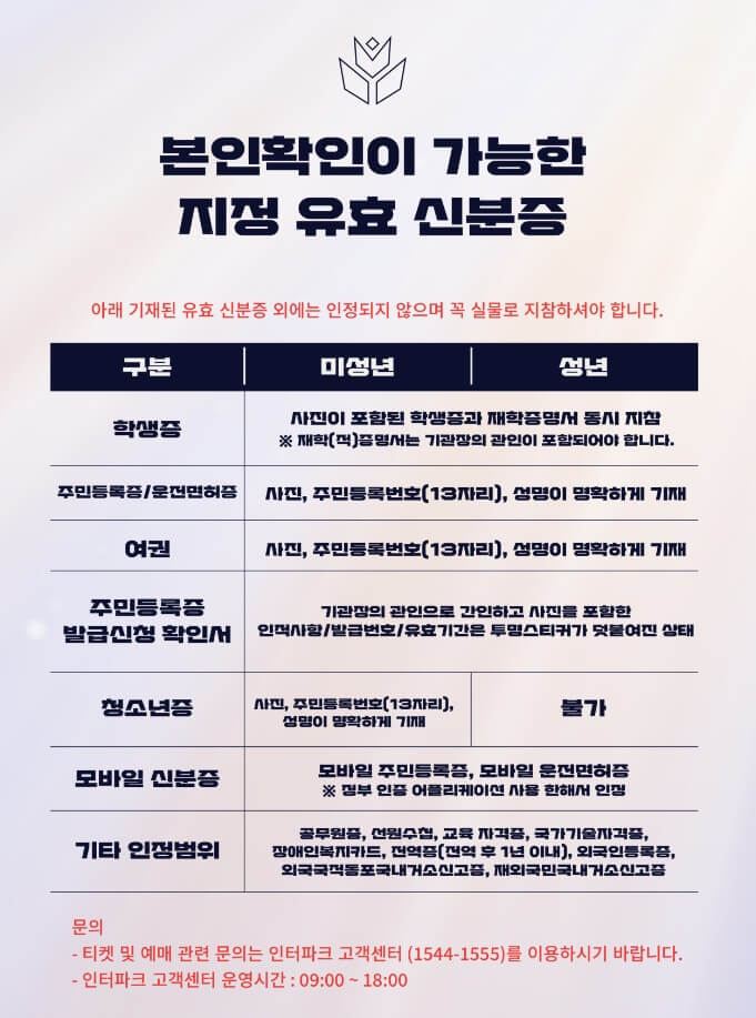 - 예매 티켓은 현장에서 본인 확인 후 수령 : 신분증 필참
