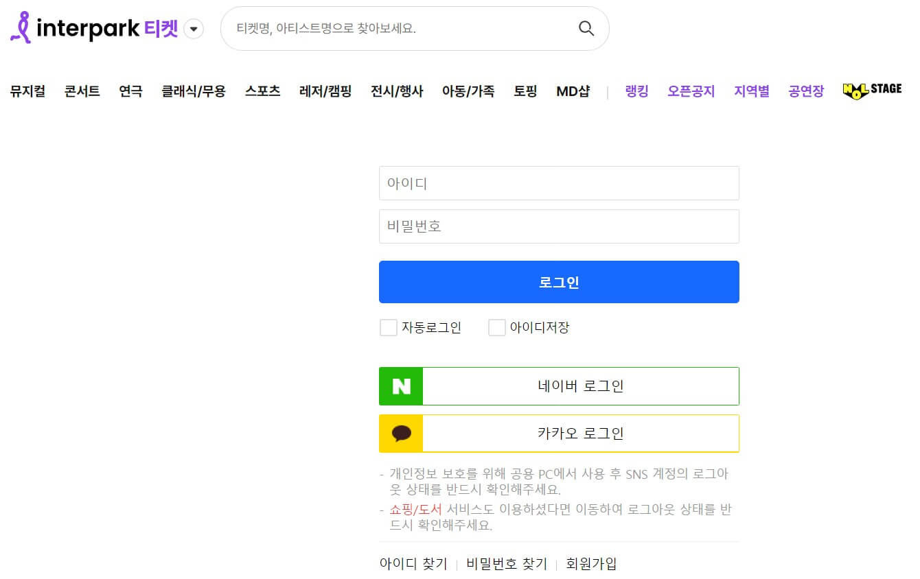 3. 인터파크 티켓 페이지로 접속을 확인하시거나, 네이버에서 인터파크 티켓을 검색하시고 접속하셔도 됩니다.