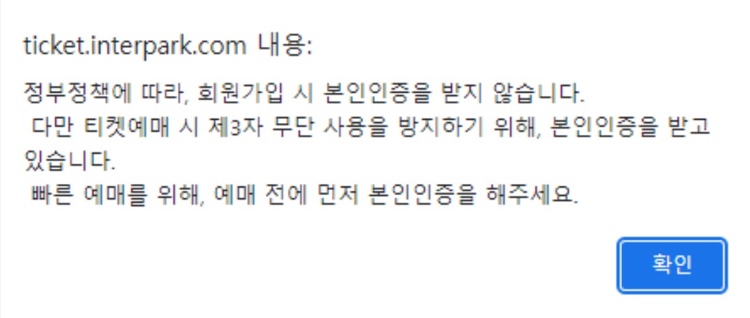7. 판매마감은 회색, 판매중은 빨간색, 판매예정은 에메랄드색입니다. 경기가 판매중일 때 예매하기 선택하실 경우 아래의 메시지가 보입니다. 본인인증을 하셔야 예매를 하실 수 있으니 꼭 완료하셔야 합니다.