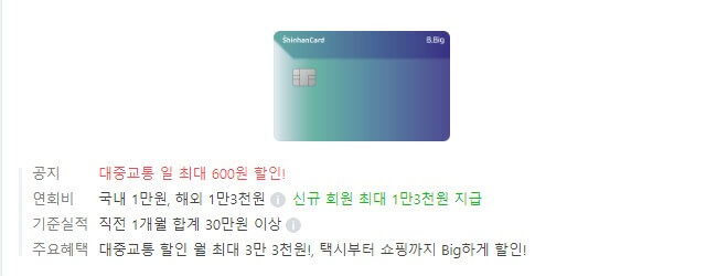 교통카드 결제 시 나는 삑 소리를 그대로 따서 만든 신한카드 B.BIG(삑)은, 이름 그대로 대중교통을 위해 만들어진 카드입니다. 버스, 지하철은 물론이며 KTX와 택시 이용 시 10% 할인을 제공하여 KTX로 이동 후 택시이용 시 부담을 덜어줘서 장거리 이동이 많은 분들에게는 가장 유명한 카드로 알려져 있습니다. 그 외에도 대시기간 머물며 커피전문점을 이용 시에도 할인을 제공하는 등 장점이 많은 카드입니다. 자세한 내용은 아래를 통해 살펴보겠습니다.